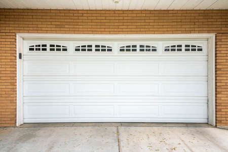White sectional garage door with window panels and concrete driveway