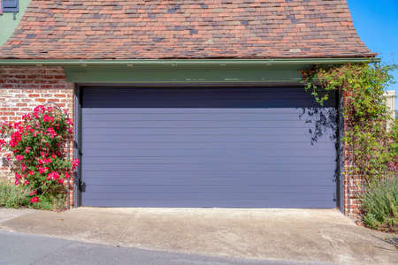 Garage exterior with weathered brick walls and purple roll up wooden garage door