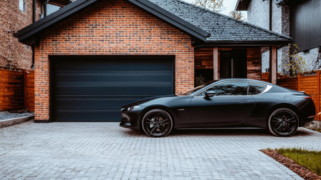 Luxury black sport car parked in front of a garage.