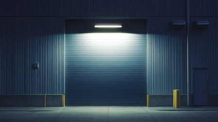 3D rendering of an industrial garage door in a dark environment.