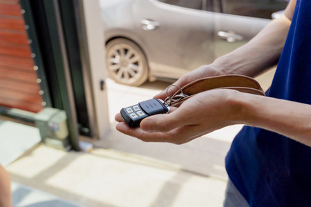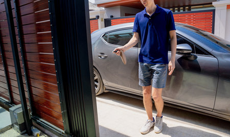 Young man using remote control to open automatic sliding front gate at modern villa