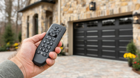 A person holds a garage door remote in hand, ready to operate the door of a modern stone house. The scene showcases a well-maintained driveway and landscaping.