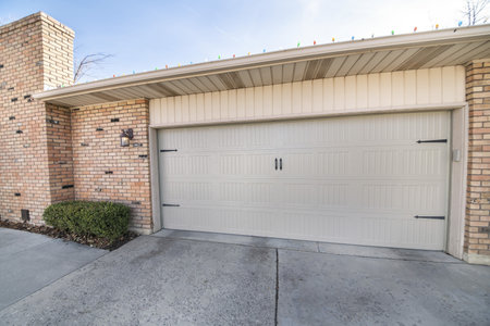 Attached garage of home with wide white door against red brick exterior wall
