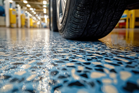 A detailed view of a rubber tire gripping a damp, grooved pavement surface inside a dimly lit indoor parking structure, highlighting texture and moist