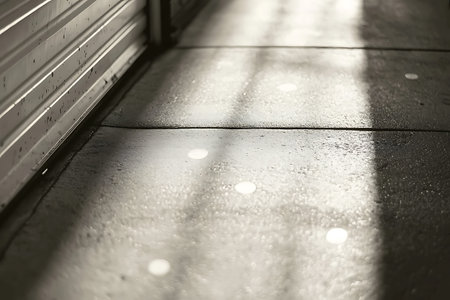 This artistic photo captures a wet concrete sidewalk illuminated by sunlight, creating a serene interplay of shadows and reflections, perfect for modern design projects.
