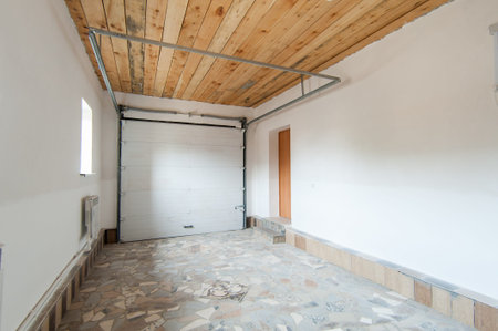 Garage with a white door and a red car parked in front of it. The garage is empty and has a lot of space