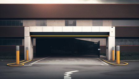 Dark entrance garage featuring a height restriction sign indicating 2.0 meters. The driveway is secured with red and white barriers, ensuring controlled vehicle entry.