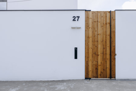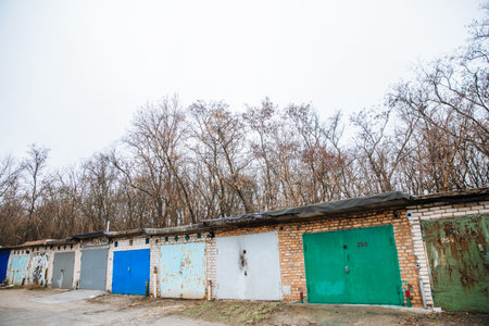 facade of a white garage with brown gates and part of a metal fence wall on the street against a blue sky