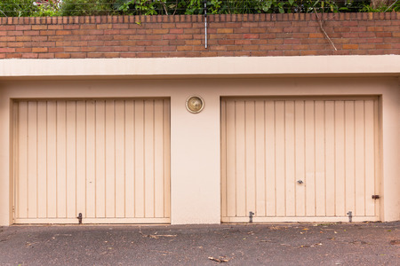 Wooden double garage door. Modern garage in new building. Closed shed door