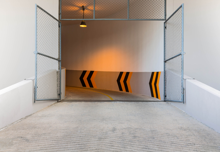 Subterranean car parking garage entry gate with switch on headlights sign and green light