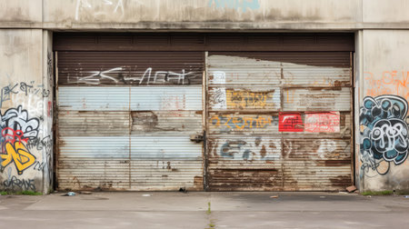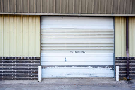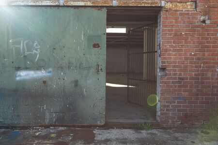 Exterior of an abandoned warehouse building, doorway and red brick wall