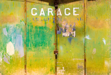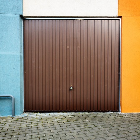 Garage exterior with weathered brick walls and purple roll up wooden garage door