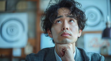 A thoughtful young Asian man with curly hair, resting his chin on his hand, looking upwards in contemplation, surrounded by blurred target boards in the background.