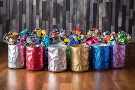 A colorful trash bin filled with discarded aluminum cans and crumpled paper sits against a vibrant turquoise background, illustrating waste management and recycling efforts.