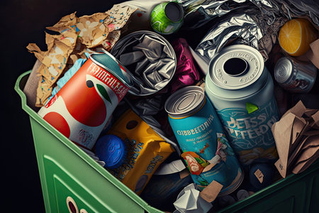 close-up of a recycling bin overflowing with recyclables, created with generative ai