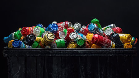 A trash can is full of garbage, including a plastic bottle with a green cap. The trash can is overflowing and has a lot of debris, including a pile of plastic bottles. Concept of waste and pollution