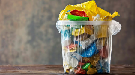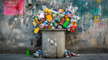 A cluttered trash can overflows with colorful waste items, set against a gritty wall, illustrating the challenges of urban waste management and pollution.