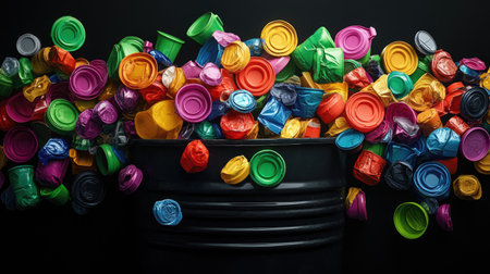 A trash bin filled with colorful plastic bottle caps, showcasing waste management challenges and the importance of recycling initiatives for a cleaner environment.