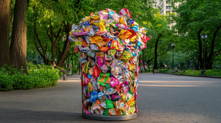 A metal trash can overflowing with colorful crumpled snack wrappers in a city park