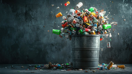 An overflowing metal trash can filled with assorted waste items creates a chaotic scene against a grunge background, highlighting urban pollution issues.