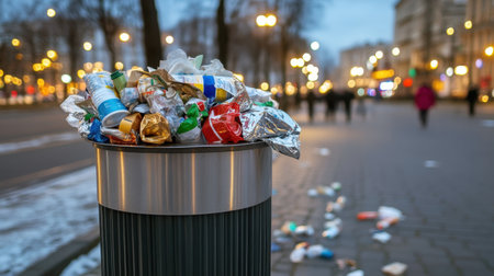 Overflowing urban trash bin with foil and plastic wrappers littering the sidewalk