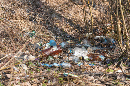 Abandoned garbage plastic and glass waste in nature among the grass. Environmental damage caused by human garbage pollution.