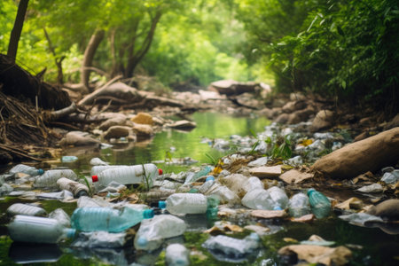 Discarded plastic bottles float on the surface of a polluted stream, reflecting the surrounding greenery as sunlight filters through the trees in the late afternoon.