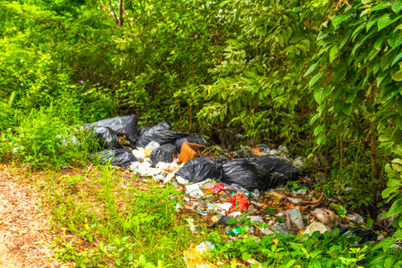 Garbage pile in forest among plants. Toxic plastic into nature everywhere. Rubbish heap in park among vegetation. Contaminated soil. Environmental pollution. Ecological issue. Throw trash anywhere.