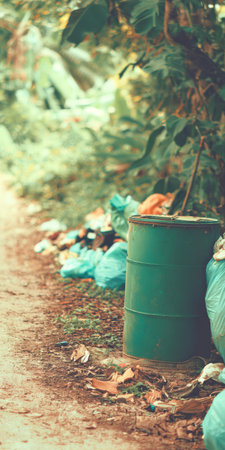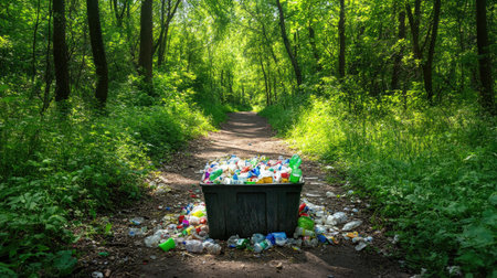 A vibrant forest scene featuring a littered trash bin along a dirt pathway, highlighting the urgent need for environmental awareness and cleanup efforts.