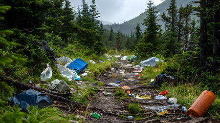 The image depicts a scenic mountain trail that has been ruined by piles of discarded camping gear and food wrappers The once peaceful natural landscape is now marred by the unsightly presence of