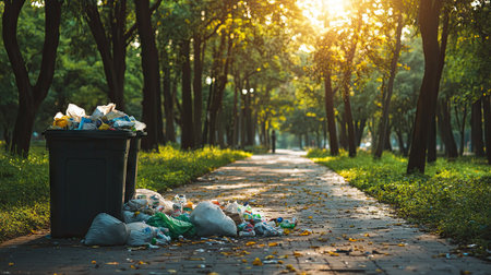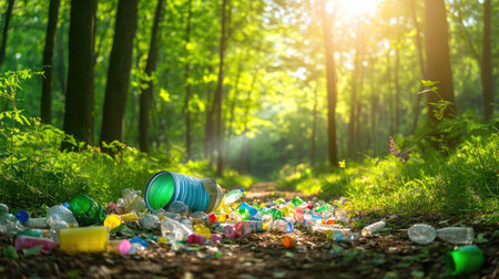 A serene forest pathway is marred by plastic waste, highlighting the environmental impact of littering in natural spaces. The sunlight filters through the trees, creating a stark contrast between nature and pollution.