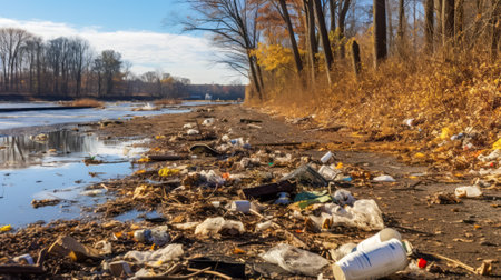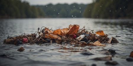 Generative AI Image of Scattered Trash Rubbish Garbage Float at Dirty Slum River Lake