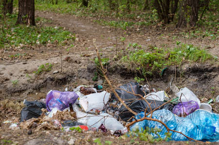 Illegal garbage dump in nature. Dirty garbage polluting the environment.