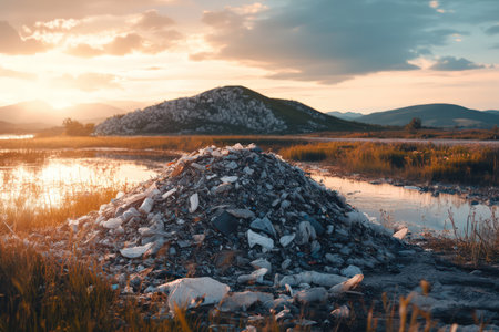 Pollution scene with heap of plastic trash against scenic sunset, symbolizing environmental crisis and sustainability challenge.