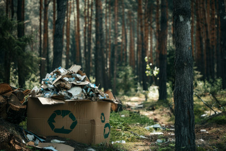 A pile of trash is sitting in a box in the woods. The box has a green label that says Recycle. Concept of environmental responsibility and the importance of recycling