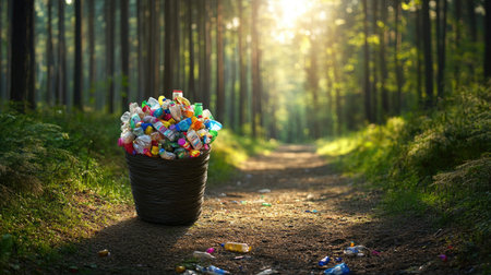 A striking scene showcases a basket brimming with vibrant plastic waste, placed along a serene forest path bathed in warm sunlight. The surrounding lush greenery emphasizes the need for environmental awareness and recycling efforts.