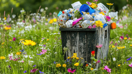 A striking image of a trash bin overflowing with waste, set against a backdrop of colorful flowers in a vibrant green field, highlighting environmental concerns.