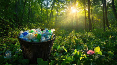 A waste basket filled with plastic bottles sits in a vibrant green forest, with sunlight illuminating the foliage and highlighting the pressing issue of pollution.