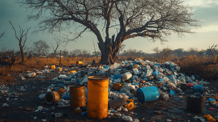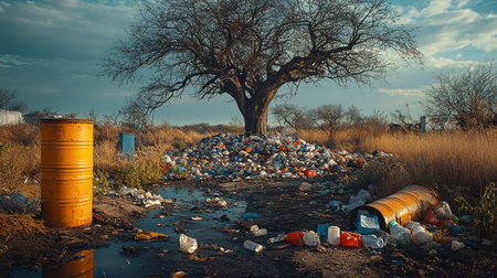 Environmental degradation revealed by a large pile of waste beneath a solitary tree in a desolate landscape during the golden hour
