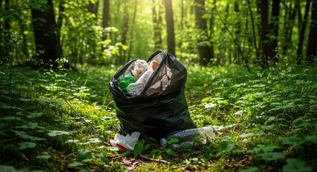 Garbage bag full of garbage in the forest. Environmental pollution concept