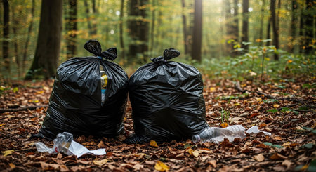 Impactful image depicting illegal dumping with plastic bags abandoned in nature, showing the environmental crisis of irresponsible waste disposal