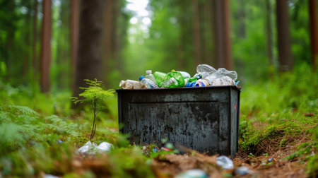 Abandoned recycling bin full of plastic waste in peaceful natural clearing