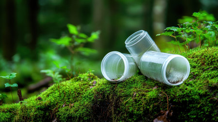 Single-use plastic containers abandoned on mossy terrain, top view eco message