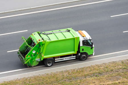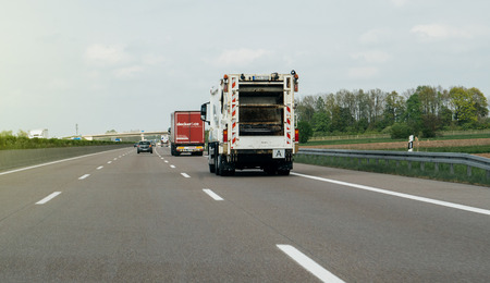 FRANKFURT, GERMANY - APR 13, 2017: Garbage truck driving fast on highway to deliver the waste to the environmentally friendly recycling site