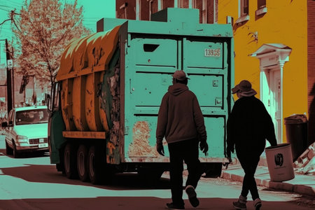 cropped shot of two people walking next to a recycling truck, created with generative ai