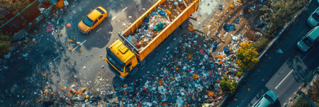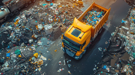 An aerial image showing a waste collection vehicle amidst a chaotic landscape of plastic and garbage, highlighting challenges in recycling and waste management.