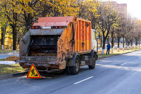 Garbage truck removes autumn fallen leaves, Collection and disposal of fallen autumn leaves in the city by employees of public utilities.