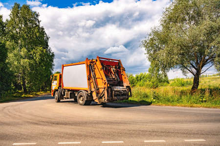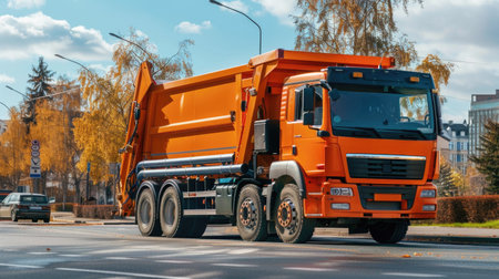 Garbage truck. Orange garbage truck. Urban recycling waste and garbage services