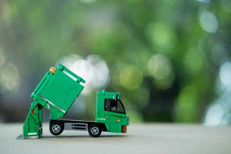 Miniature green plastic garbage truck. Children toy. Garbage truck toy