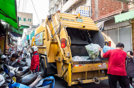 Nantou, Taiwan - April 8th, 2019:yellow garbage truck for collects garbages in the traditional marketplace at Puli township, Nantou, Taiwan, Asia